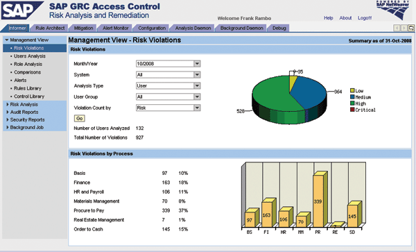 - Job 3. Management reports. This job uses the results of the batch risk analysis job to summarize the high-level data to be presented in graphical formats in the informer tab (Figure 6). From the analysis results, the system calculates and stores the total number of violations and distributes the violations with respect to business process and with respect to risk criticality. The system keeps one set of management report data for each month. Every time a management report is run, the management report data is overwritten for the current month.