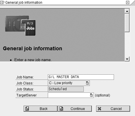 Step 4. Schedule the job. In transaction SM36 enter the job name RSPROCESS and then click on the Job wizard button. On the initial job wizard page, click on the Continue button. Next, the wizard asks you to enter a Job Name (Figure 4). The job name you create must be different from the variant name, which is more of a technical name. Make sure this is descriptive because this is the name that you see when you run transaction SM37. In my example, I used G/L MASTER DATA for the job name.