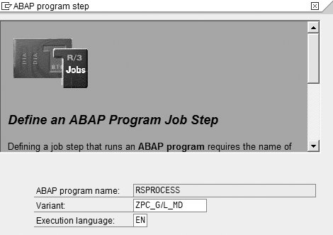 In the screen that appears, select ABAP program step and click on the Continue button. On this next screen, enter the ABAP program name RSPROCESS and the name of the previously created variant, ZPC_GL_MD, as shown in Figure 5. Click on the Continue button to skip the next screen, which is called Multi-Step Jobs.