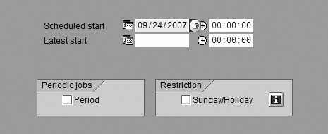 In the screen that appears, click on the Immediate button to change any existing scheduling. You may wonder why you should click on the Immediate button if you don’t want the process to start right away. By clicking on this button, you are telling the start process that the nature of the start is immediate — when the scheduling specifies a date and time, the system launches the job immediately at that time without any conditions. This also allows the scheduler to start the job as scheduled. Make sure that the Periodic job check box is not selected.