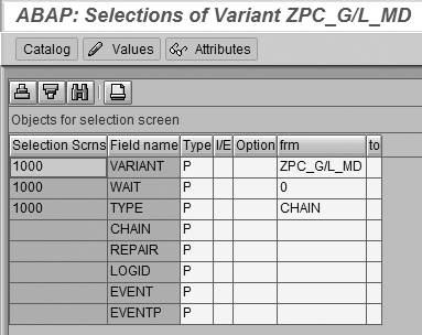 If the variant name does not appear in the frm column in Figure 9, click on the Values button. This takes you to the variant maintenance screen in which you can enter the variant name. The variant name may not appear if the variant wasn’t created properly in step 2 of the “Create a Job Variant” section.