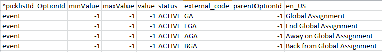 - Once you have exported the file, add the entries (shown in Figure 3) to your picklist (if they are not already in the picklist). You may change the label, but do not change the external code. Making changes to the external code prevents triggering of the Global Assignment process since the logic is already built in to look for the specific Event or Event Reason external code in Employee Central.