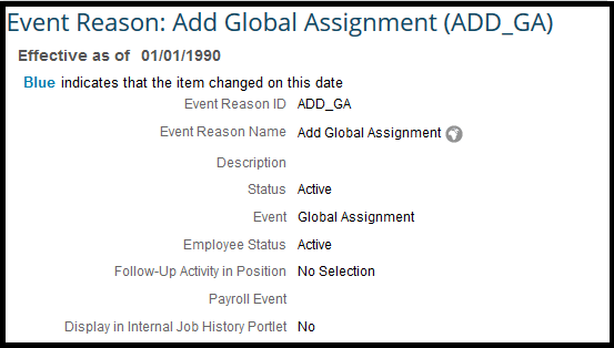 You must assign the Event Reason to the Event Global Assignment as shown in Figure 4. This is because when you choose the Event Reason Add Global Assignment to initiate the assignment, the system creates a Job Information record with the Event Global Assignment and the Event Reason Add Global Assignment. When you are done, you should have successfully created the Event and corresponding Event Reasons as shown in Table 1.