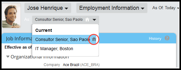 In Figure 6, you see that Sao Paolo is the employee’s home record location and Boston is the host record location (the home record is indicated by a little house icon, circled). Click either option to be taken to the home or host record, respectively. If you go to host record and click History in the History of Job Information portlet (Figure 7), you see the employee’s newly created Global Assignment record with the Event and Event Reasons (on the right).