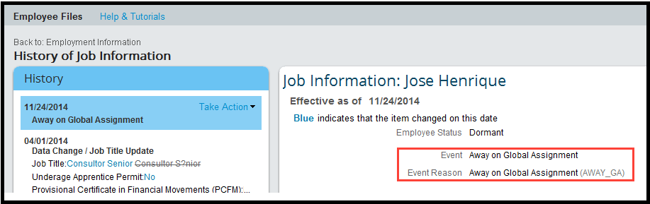 Now go to the home record and click History in the History of Job Information portlet (Figure 8). You see the employee’s newly created Global Assignment record with the Event and Event Reasons (on the right).