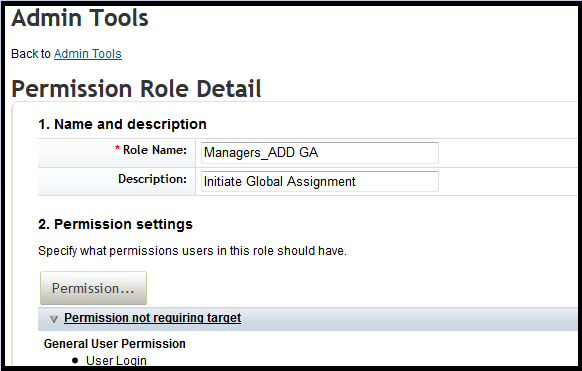 The Role Name and Description for the managers who has permission to add Global Assignments to roles