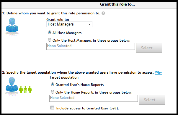 6. The next step is to grant this permission to host managers. Scroll down to the Grant this role to… section (Figure 15). In the Grant role to: field, select Host Managers from the drop-down options, and select the All Host Managers and Granted User’s Home Reports radio buttons. Then click the Save Changes button (not shown) to save your new entries, and the host manager now has permission to view, add, edit, and end Global Assignments only for their home direct reports.