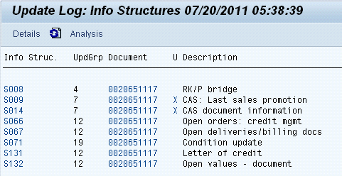 In the following sections I show you the detailed views of the SIS update log for each process step of the SO’s process life so that you can clearly see how the credit data is updated. Seeing the updates at each stage can help you identify incorrect update data when you look at the logs.