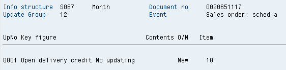 For this SO schedule, line 1 was initially created when the order was on credit block with no confirmed quantity. After the release of the credit block, Available to Promise (ATP) functionality is rerun for the SO, creating a second schedule line with a confirmed quantity (Figure 16). This is the reason why there are two New and only one Old schedule lines in the S066 update (Figure 15). At this stage there is no delivery, so there is no S067 update (Figure 17).