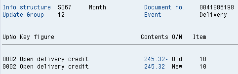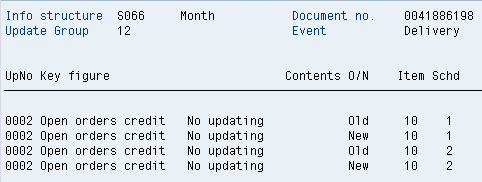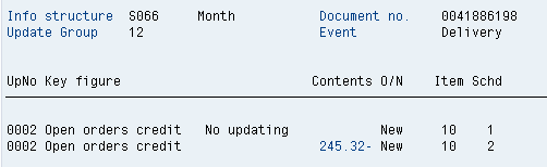 Perform PGI delivery using transaction code VL02N. There is no change in credit values because no new document relevant for credit is created. Note the nature of the S067 update with both a negative and positive value (Figure 20), which results in a net 0 update. The SIS update appears this way for any change with no credit impact (e.g., subsequent change to the SO with no credit impact). There is no S066 open order update (Figure 21).