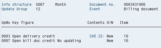 Create a billing document using transaction code VF01. There is no S066 update record in this case, only S067 (Figure 22), removing the open delivery credit value. There is no open billing value update because the FI invoice is created at the same time as the SD invoice, so the credit value moves immediately to open AR.