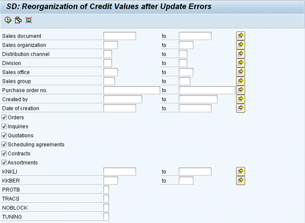 When you are running RVKRED07 directly with the no locking option selected, do not populate any of the initial selection criteria. You also accept all the default check box selections (Orders to Assortments) and populate the fields with the technical names (KNKLI to TUNING) following the recommendations shown in Table 3.