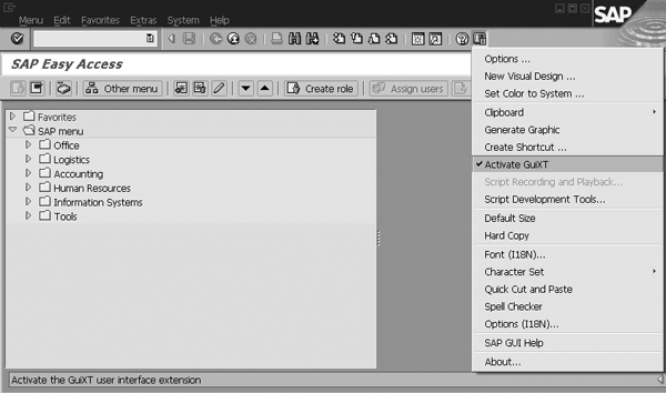 Step 1. Activate GuiXT. Users of GuiXT may activate or deactivate it using the SAPGUI options menu (Figure 2). From SAPGUI Release 4.6B, click on the menu bar icon