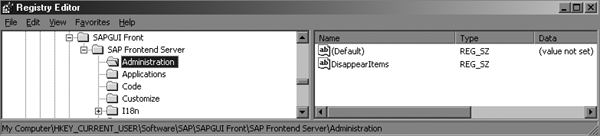 If you cannot find the Activate GuiXT option in the menu, then check the values in Windows Registry Editor for the setting: HKEY_CURRENT_USERSoftwareSAPSAPGUI FrontSAP Frontend ServerAdministration. Search for the DisappearItems string (Figure 3). If Activate GuiXT is the value of the string (DisappearItems=Activate GuiXT), then Activate GuiXT remains invisible in the SAP menu. To delete other menu items, enter the corresponding texts one after the other, separated by a semicolon. You can hide these entries: Clipboard, Activate GuiXT, Hard Copy, Quick Cut and Paste, and Spell Checker.