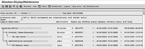 Figure 3 shows the output from report RHSTRU00 using the evaluation path displayed in Table 4. This evaluation path produces a graphical representation of the root organizational unit and all related positions and persons. Unlike example 1, this path did not take any subordinate organizational units into account when evaluating the structure. This was accomplished by removing the third step in example 1, which searched for organizational units related to the root by a B 002 Is line supervisor of relationship. The absence of this step limits the output to the root organizational unit.