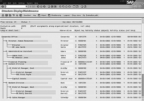 Figure 4 shows the output from report RHSTRU00 using the evaluation path in Table 5. This path produces a graphical representation of the root organizational unit and its subordinate units, all cost centers associated with those organizational units, and all related positions, jobs, and persons. It differs from example 1 because it also evaluates for jobs that are related to the positions in the path and for cost centers that are assigned to the organizational units. It is a good example of how a view of a structure can change based on which related objects you include in your evaluation path.