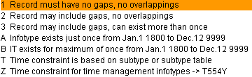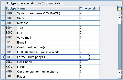 I created the new subtype entry 9REF Former Third party ERP with the time constraint 1, which means that this record must be available at all times and cannot have any time gaps (Figure 2). Carefully review the available entries and select the one you need according to your own requirements. If you are not sure which time constraint to use, check with your business department to see which entry is relevant. Before you enter your subtype entry, be sure that you do not delete the last record stored on the database because this deletes all the records of this infotype.
