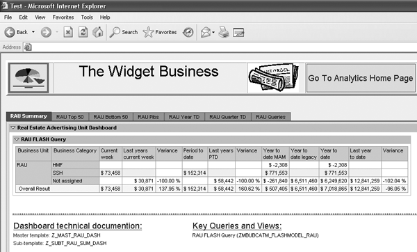 First I’ll explain how to set up the home page framework, and then I’ll show you how to organize multiple master dashboards using Web AD and BEx Web Analyzer in BW 3.5. The master dashboard allows users to view query results from the first few tabs and run queries from the last tab, which then renders results in BEx Web Analyzer. From here, they can click on the Go to Analytics Home Page link to return to the home page to choose a different dashboard. Users cannot get lost or stuck in a dead-end with this framework because both the master dashboard and BEx Web Analyzer have links to take them back to the Analytics home page.