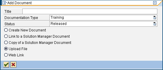 Once you save your modifications, the nodes are visible on the left side in the structure. Navigate to transaction SOLAR02 and then you can make use of the Training Materials tab to which you assign the content. In this example, I assign content into the Training Materials tab at this level of the structure, rather than the business process level. To do this, click the insert document icon, browse to the file, and upload it by selecting the Upload File radio button and clicking the green checkmark icon (Figure 3).