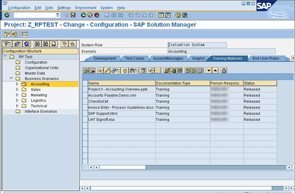 The actual inclusion of your training materials (e.g., written documentation, presentations, eLearning links) is done in transaction SOLAR02 in the Training Materials tab. This means that all actual content management is handled in the familiar transaction SOLAR02 and not directly in any Learning Map-related transaction. It also means that you can use all the SAP Solution Manager documentation functionality available for blueprint management, such as checking in and checking out the documentation, attributes, direct editing, copying, and moving. Therefore, you can assign relevant training-related material against an existing business process structure associated with a project in transaction SOLAR02. Figure 1 shows an example of an existing project with a business process structure.