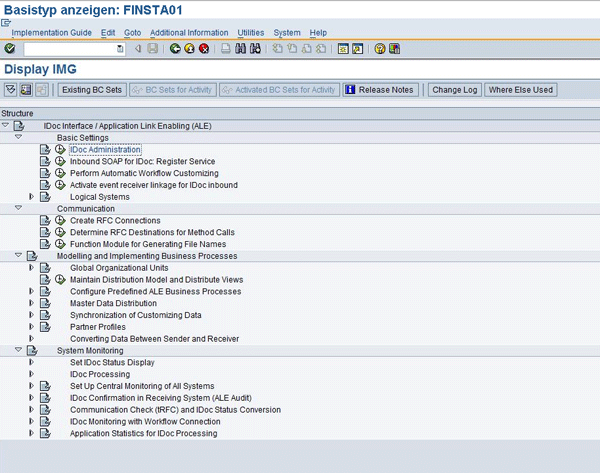 To configure the communication between the various SAP systems, you need an ALE distribution model. The ALE distribution model identifies the logical SAP systems and describes the message flow between these systems. It also defines which IDoc messages are exchanged between the logical systems. You can access the configuration of the ALE distribution model by following IMG menu path SAP NetWeaver > Application Server > IDoc Interface/Application Link Enabling (ALE) > Modeling and Implementing Business Processes > Maintaining the Distribution Model. You can also use transaction SALE, which provides you with a submenu containing all relevant ALE configuration steps (Figure 1).
