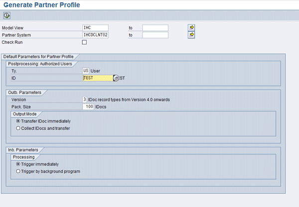 Create the partner profiles for the communication between the logical systems. Use transaction BD82 or follow IMG menu path SAP NetWeaver > Application Server > IDoc Interface/Application Link Enabling (ALE) > Modeling and Implementing Business Processes > Partner Profiles > Generate Partner Profiles (Figure 5). You have to define the ALE distribution model and execute this report on every system locally. Choose the option Transfer IDoc immediately.