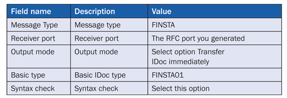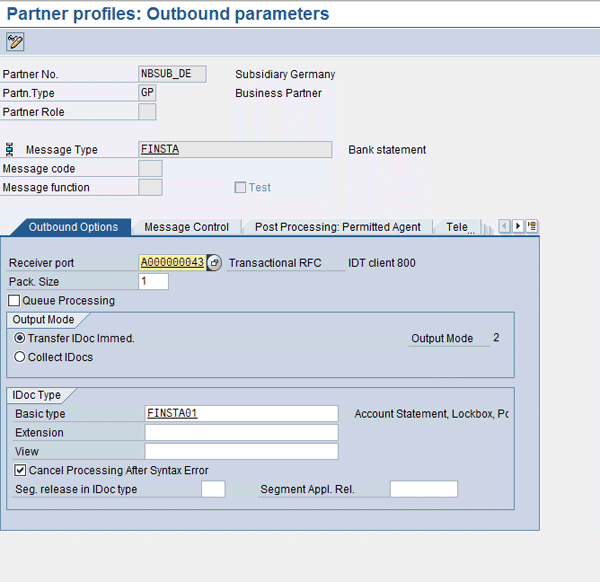 The first five steps are similar. The only difference is that you enter all settings for the subsidiary instead of the head office. In step 6 you need to create only one partner profile for B (bank). You have to create the in-house bank with transaction FIHC. You can’t create these partner profiles for the in-house bank if you haven’t first created a house bank with transaction FI12. The partner type settings for B are the same as above with BP. You need to create an inbound parameter for the message type FINSTA and two outbound parameters for the message types PAYEXT and DIRDEB. The settings for the inbound parameter are shown in Table 8. The settings for the outbound parameter are shown in Table 9.