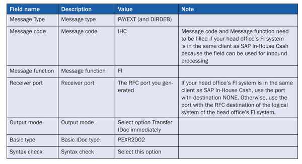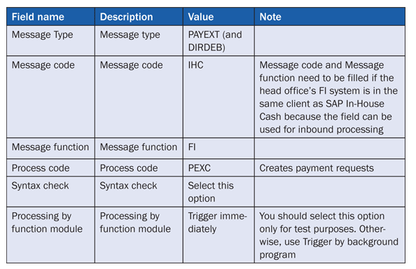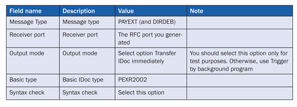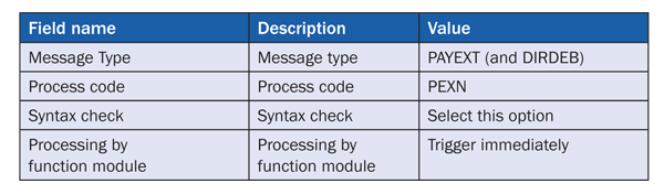 For the outbound parameters, you have to maintain for the message types DIRDEB and PAYEXT the entries shown in Table 5.