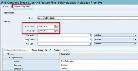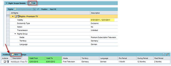 SAP IPM allows for rights to be licensed exclusively to a client or to be blocked from some other market or territory. For example, a licensee bought rights for original premium TV distribution for 2011, but requests a holdback against free TV from December 2010 to February 2012 to earn non-competitive profits for the duration of the first quarter. Just as in options, holdbacks require an extra fee. In this case, the licensee is still allowed only to exploit the premium TV market but is also ensuring that no one else can exploit free TV in a specific territory or language.