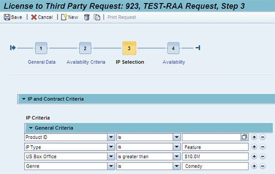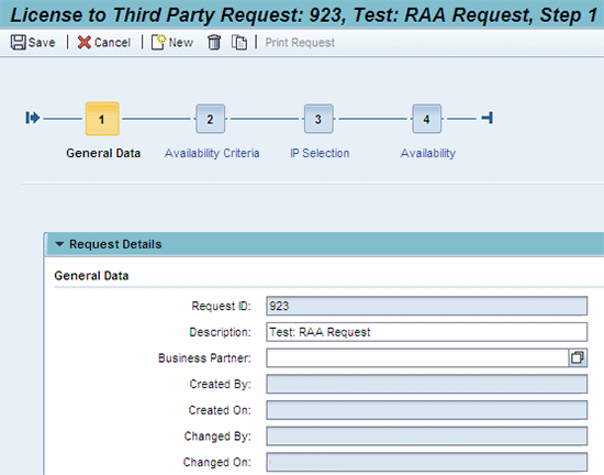 The first component of the RAA tool is General Data (Figure 14). In this step, the user enters the basic data of the RAA request including the mandatory text for the description field. The system automatically generates the Request ID after you click the Save button. SAP IPM gives the option of configuring the number range for RAA requests. Except for Business Partner, the system auto populates the remaining fields of the step 1 screen. The Business Partner field in step 1 has no relevance and no functionality is associated with it. However, you can enhance this field to incorporate the logic for satisfying unique media industry requirements around licensee-specific exclusivity.