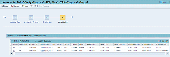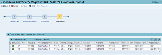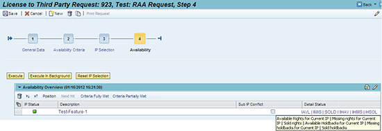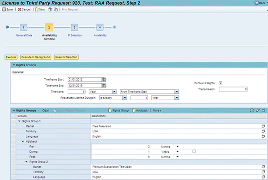 The Availability Criteria screen supplies parameters to help create the desired avails results. RAA allows users to select and execute the multiple rights dimensions combinations in a single avails request. You set up the RAA request by specifying the time frame for which the IP availability is to be searched. Within the requested time frame, you can set up the requested license duration (RLD), which is one of the new features available in SAP IPM enhancement package 1, version 7.0. This feature proposes the earliest possible license period within the requested time frame. Another new feature in 7.0 is the setup of holdbacks in RAA. Per the business scenario in this article, the rights manager of the company searches for five years using the parameters entered in step 2 of the wizard: