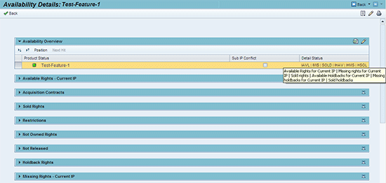 The IP Availability Details section of step 4 gives you the detailed analysis of the IP’s availability status. It gives you the information both from IP rights in as well as rights out used to determine the IP’s availability status. It gives the time frame in which the requested rights are available and the missing rights within the requested time frame. It also gives the license sale and acquisition contracts that contain the rights that were sold to a licensee. This information is captured in individual assignment blocks. Figures 18 and 19 show the type of detailed information that is available.
