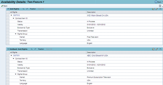 Rights can be licensed either exclusively (blocking availability completely in a specific market and territory) or non-exclusively (allowing other companies to license it too). Rights views and templates can be used as quick data entry tools to set up rights scopes and rights groups. Figure 9 shows rights being licensed out in an SAP IPM contract.