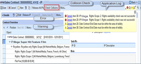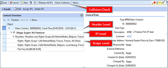 - Collision checking at the contract header level: At the Deal header level, the collision checking functionality performs for all the IPs and the underlying scopes in the contract. It checks the rights conflicts defined for a whole contract with other overlapping IP rights and other contract rights. The collisions in the form of messages are displayed in the Collision Check assignment block at the license sale contract header level.