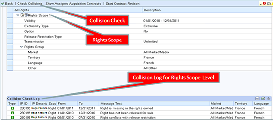 - Collision Checking at Scope Level: The collision checking can be performed at the individual scope level within a contract (Figure 25). When checking at the scope level, the SAP IPM only checks the rights defined for a scope with other overlapping license sale rights and IP rights.