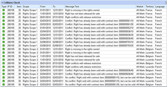 The message that No conflict: Right sold with contract item <contract number/line item number>, but can be sold describes the rights out message and gives the rights conflict with another license sales contract (Figure 31). The license sale rights for which you are trying to run the collision check have been sold non-exclusively in another contract and hence conflict in the same media, territory, and language for a given time period. As described in the previous section, this type of collision check message only comes when the rights have been sold in another license sales contract non-exclusively.
