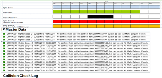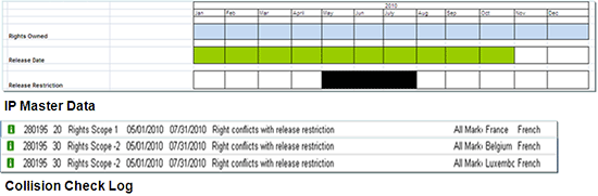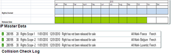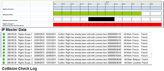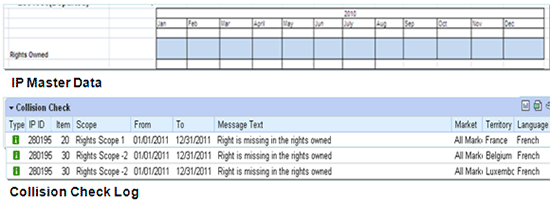 The collision checking function of SAP IPM is available in the license sales contract. The purpose of this functionality is to ensure that there are no rights conflicts in the contract. To trigger the collision checking functionality, clicking the Check Collisions button in the license sales contract and the results in the form of messages are populated in the assignment block. The collision checking function checks the rights components of IPs as well as contracts. It represents the process that provides rights validation. The collision checking in the license contract identifies conflicting rights sold in a separate contract (i.e., two or more contracts that conflict in the same market, territory, and language combination that share overlapping term dates). The standard system checks the rights conflicts in the following order: