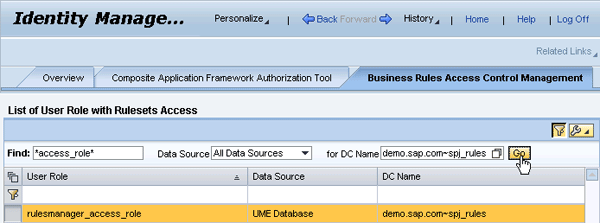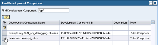 Click the Go button and the system fills the table with appropriate rules DCs that fulfill your search criteria. If you followed my articles so far, you’ll recognize the spj_rules DC. Select it in the table and as result the window automatically closes with the selected DC appearing in the DC Name field of the Business Rules Access Control Management tab (Figure 10).
