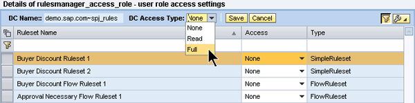 Now change the DC access type to Full and the access entry for Approval Necessary Flow Ruleset 1 to Full as well. This allows you to modify the contents of the decision table. Save your changes by clicking the Save button. Figure 13 shows the final result of your changes.