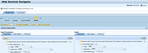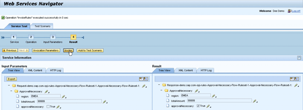 Verify the correct behavior of your ruleset by applying the same data you used for testing your ruleset in the Web Services Navigator again. For this, you just have to click the Invoke button in case you haven’t closed the Web Services Navigator window after your first test run (Figure 20). This time, an approval is necessary as 99,999 exceeds the new threshold of 50,000.