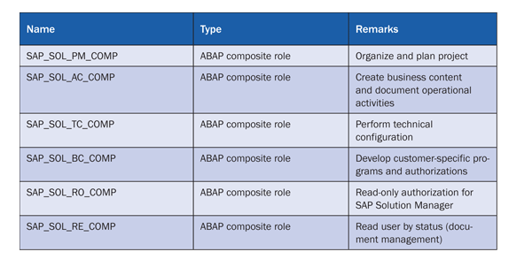 Project roles fall under both areas: standards and procedures. Project roles help define project tasks and standardize SAP Solution Manager security roles (Table 3). Project roles also help when you are standardizing security roles for specific project roles. You can use the SAP Security Guide from SAP Service Marketplace to get started with standard roles. Your standards and procedures document should list the security roles that are assigned to SAP Solution Manager users depending on their project role. The keys to this procedure are defining the roles, determining the process for assigning roles to individuals, and making changes to roles (if needed).