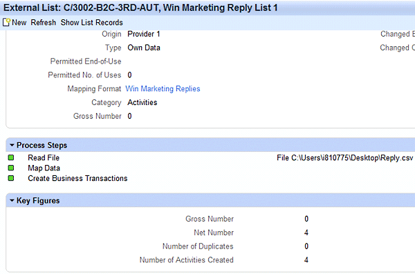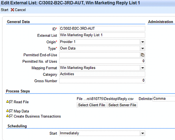 Once a mapping format has been established, you can create an external list for each of the returned vendor files of response data. When you use the Activities category, the only process steps that you can perform are reading the file, mapping the data (using the assigned mapping format), and creating business transactions. In this scenario, I am only importing the business partner ID of the people who want to accept the offer that was emailed (Figure 9). You can start the import immediately or schedule it to run as a background job. You could alternatively automate the import using a recurring job.