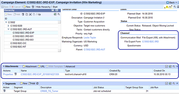 The first campaign element triggered on campaign start is the Campaign Invitation (Win Marketing), as shown in Figure 5. This element uses the File Export communication medium, which creates a file of all the business partners in the target group in CSV or XML format. You can create the file export form by going to the Marketing work center and clicking the Mail Form link on the left side of the screen shown in Figure 3. Search for your form in the marketing planner to assign it to the campaign element (Figure 5). The file export form C/3002-B2C-3RD is assigned under the Channel section of the screen. You can see that a new attachment has been created by the system in the Attachments section. The attachment is linked to the file that was generated using the file export form.