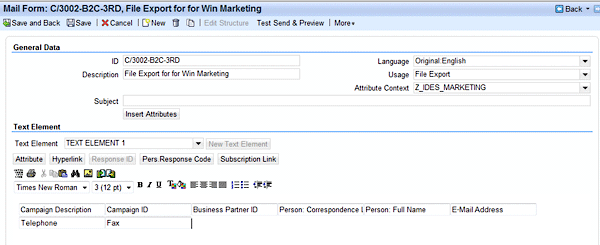 The file export campaign element uses a file export form to generate a new attachment with all the business partner information fields associated with the target group. Click the form name in the campaign planner (C/3002-B2C-3RD in my example) to navigate to the details of the mailform (Figure 6).