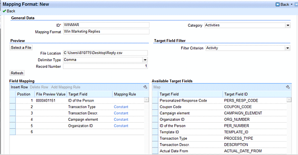 In this scenario, I use the ELM tool to import the response file from the vendor. To create an external list for the vendor’s returned file, you need a mapping format that identifies the fields of information and how they are mapped to fields in SAP CRM. In Figure 7, I used the ELM Activities category. This allows me to specify mapping of fields from the supplied file to the target fields within my activity transaction. Note that in my scenario, the prospect data has already been defined, so I’m only using the ELM tool as a method for generating the creation of activities for each business partner in the list I will import.
