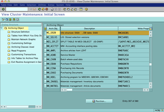 To create an archiving object for an info structure, execute transaction code AOBJ. In the Cluster Maintenance screen (Figure 4) select MC_S920 and then click the details icon