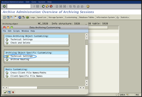 To maintain technical settings for customization for archiving, define the file path for the content repository. The content repository is the file server in which the info structure is archived. Execute transaction code SARA > Customization > Archiving Object-Specific Customizing: > Technical Settings (Figure 7).