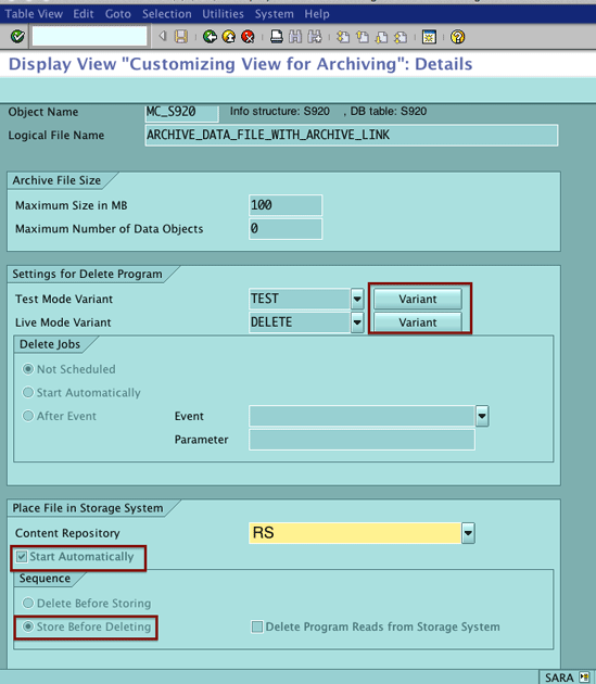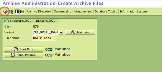 After the pop-up screen closes, click the execute icon in Figure 14 to create a job in the background. The status of the store session can be checked in management (Figure 9). The status of jobs created by the store session can be checked by executing transaction code SM37. Once the storage job is completed, the archived file is stored in the content repository RS that you defined earlier (Figure 8).