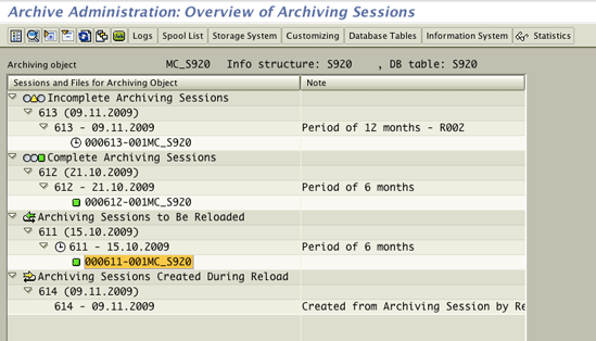 To check the status of any sessions, execute transaction code SARA. In the initial screen for archive administration (Figure 6), click the Management button. The next screen shows an overview of sessions for archiving and reloading (Figure 9).