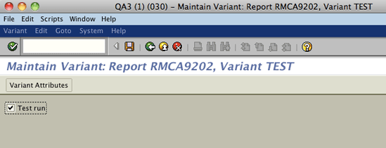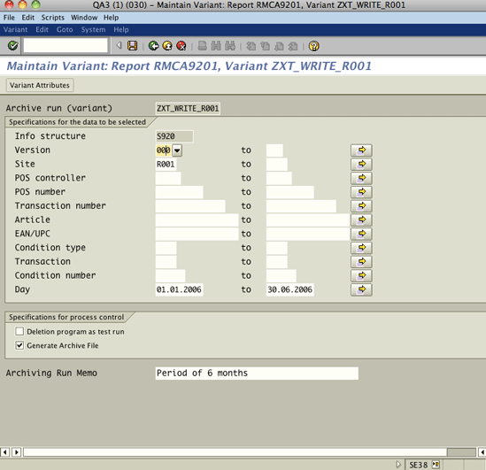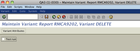 We recommend a test run to ensure all the parameters are good. Deletion is very critical, and deleting the wrong data may require a lot of tedious data reload activity. To maintain deletion variants, execute transaction code SARA and follow menu path > Customization > Archiving Object-Specific Customizing: > Technical Settings. This path takes you back to the screen shown in Figure 8. Click the Variant button beside the TEST option (Figure 15).